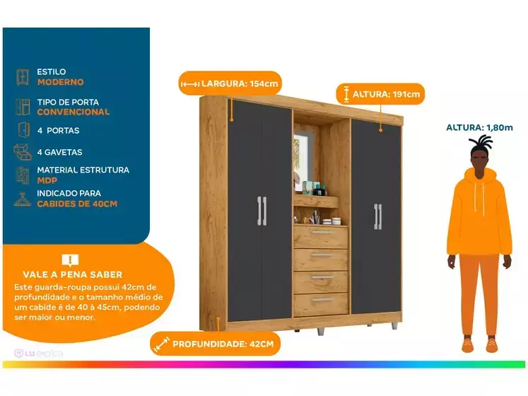 4 portas amplas com espelho: o espelho integrado não só amplia visualmente seu ambiente, como também facilita sua rotina de vestir, garantindo praticidade e estilo.